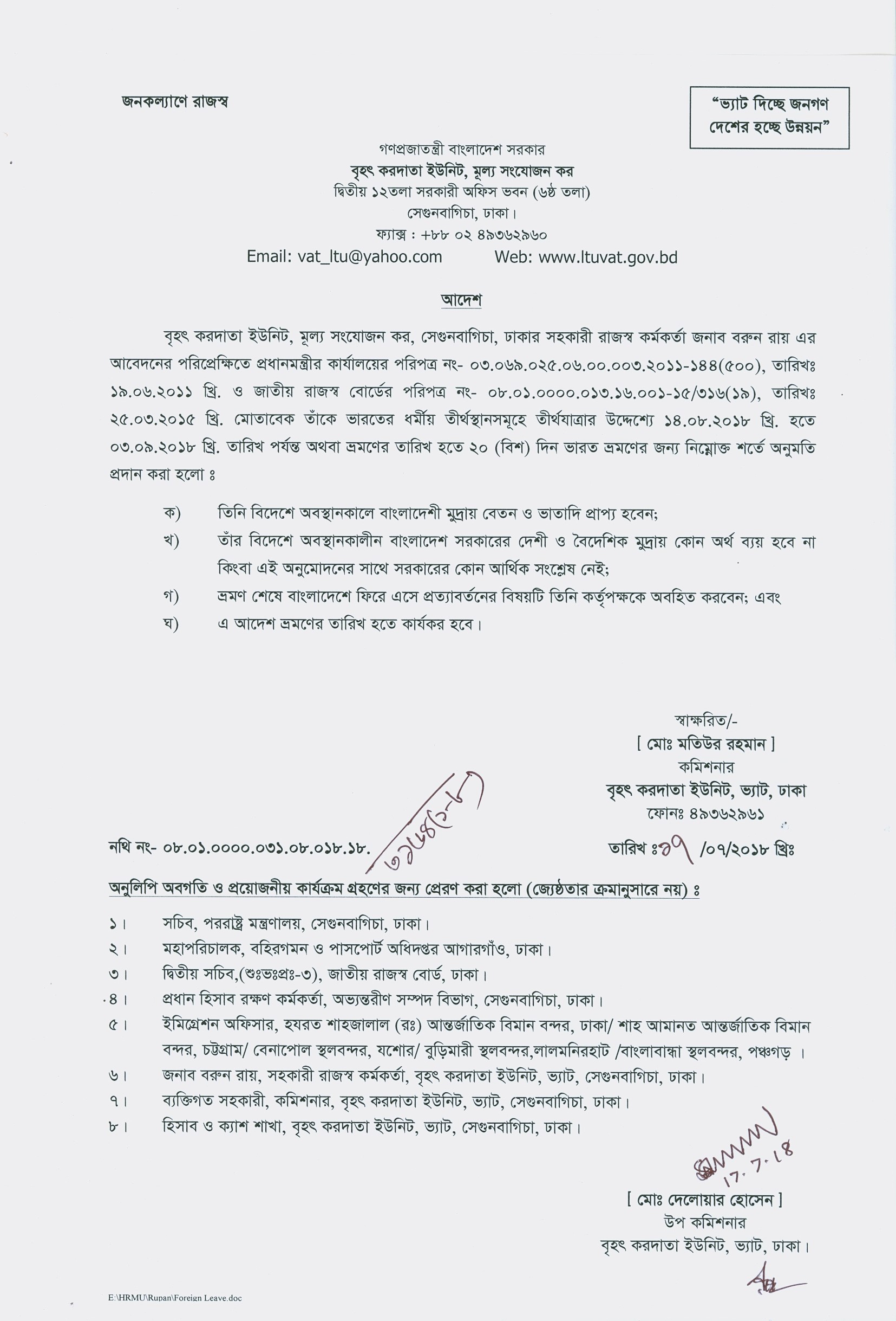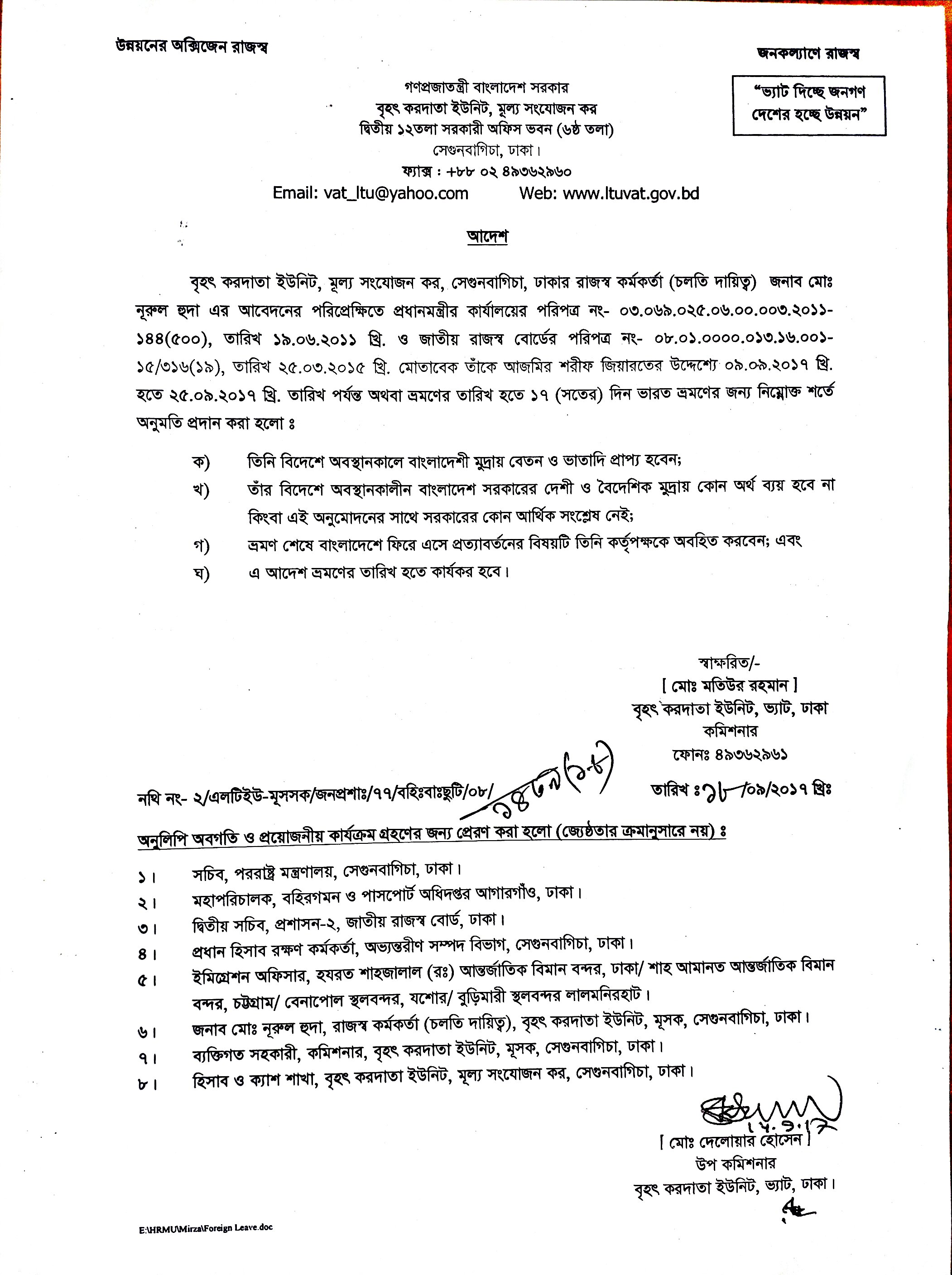 মোঃ আহসান হাবীব, উচ্চমান সহকারী এর বহিঃ বাংলাদেশ ছুটি
